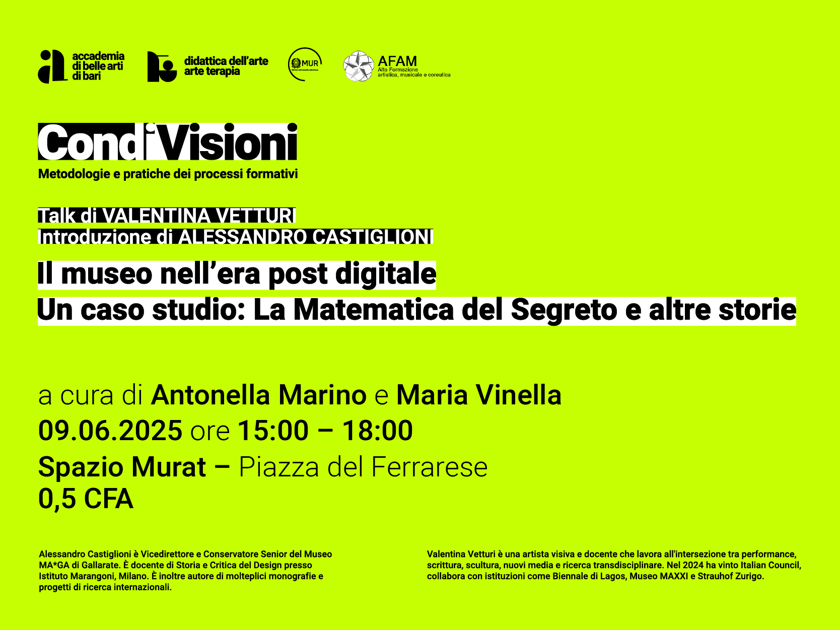 Il talk è parte del progetto CONDIVISIONI. Metodologie e pratiche dei processi formativi, promosso dalla Accademia di Belle Arti di BariScuola di Didattica dell’Arte con il Dipartimento di Comunicazione e Didattica dell’Arte. Un articolato programma di seminari, workshop e masterclass che attraversano il secondo semestre dell’anno accademico 2024/2025.