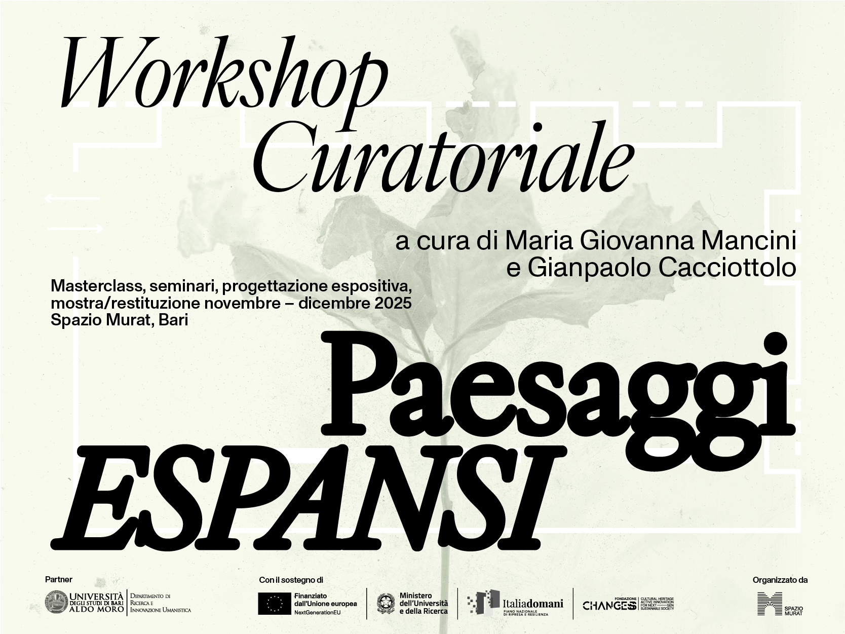 Dopo la grande partecipazione all'open call, il workshop curatoriale, a cura di Maria Giovanna Mancini e Gianpaolo Cacciottolo, organizzato e sostenuto da Spazio Murat e Fondazione Changes, con il partenariato del Dipartimento di Ricerca e Innovazione Umanistica dell'Università degli Studi di Bari "Aldo Moro", sta per iniziare.