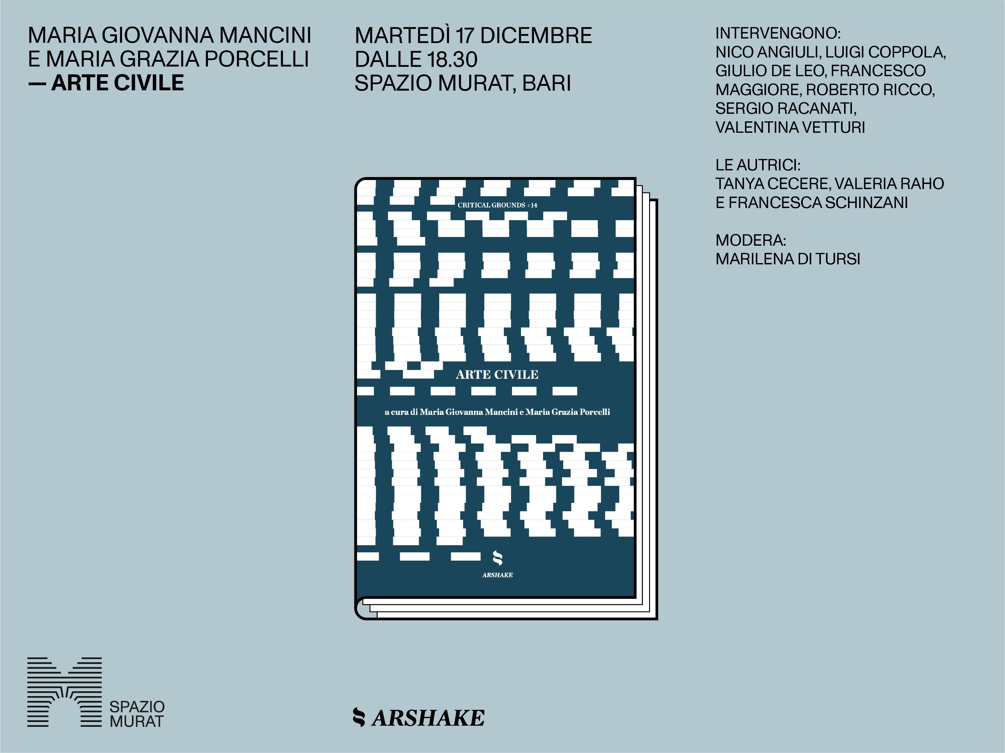 Martedì 17 Dicembre alle ore 18.30, Spazio Murat, centro per l'arte e la cultura contemporanea della città di Bari, è lieto di presentare il volume "Arte Civile" .