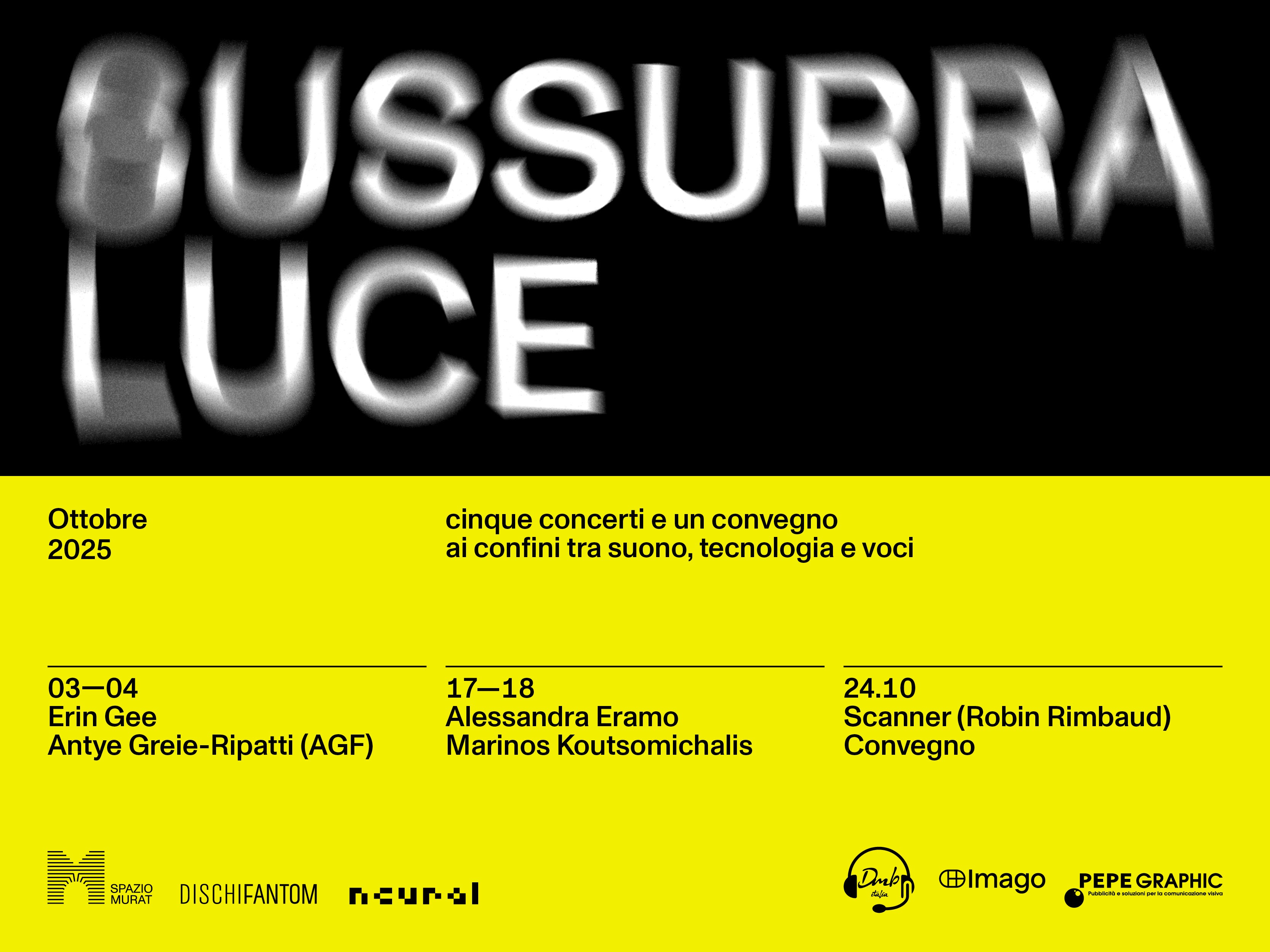 Spazio Murat presenta la terza edizione di Sussurra Luce, il progetto che esplora i confini tra suono, tecnologia e voce. Il programma di quest'anno prevede cinque appuntamenti e un convegno. Alla direzione artistica di Francesco Cavaliere e Massimo Torrigiani si aggiunge il contributo di Alessandro Ludovico in qualità di curatore.